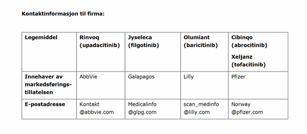 18. mars i år ble det sendt ut et informasjonsbrev til helsepersonell fra Statens legemiddelverk i samarbeid med legemiddelselskapene AbbVie, Galapagos, Lilly og Pfizer, som har JAK-hemmere på markedet. Her informeres det om den økte risikoen og at produktene bør sees på som siste utvei for pasienter med kjente risikofaktorer.